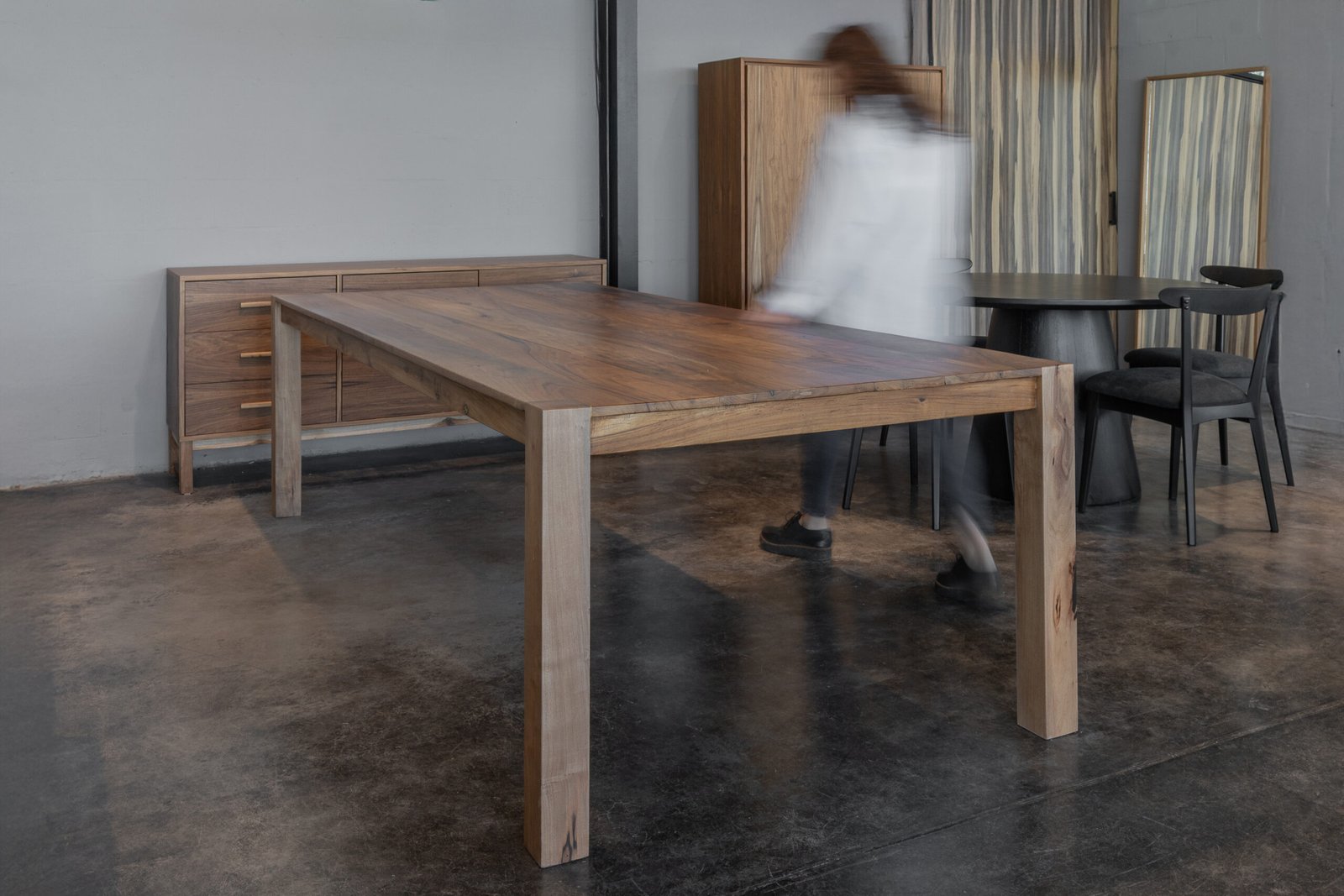 En la foto mide 270cm x 120cm y está elaborada en madera maciza: tapa en Guayca y patas en Zoita.